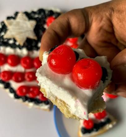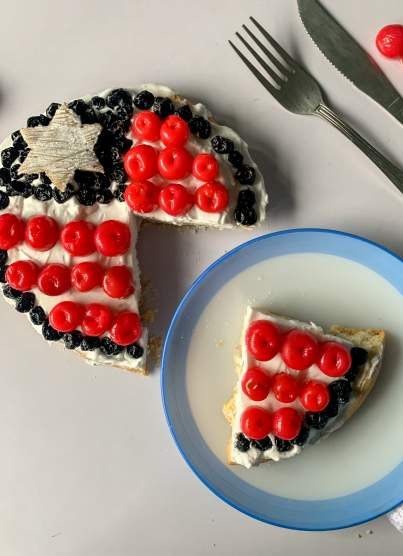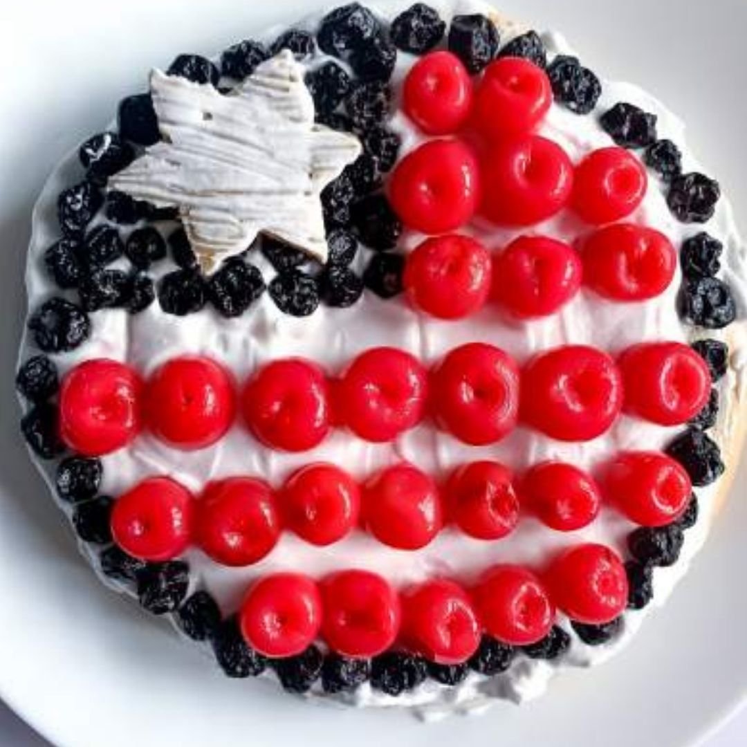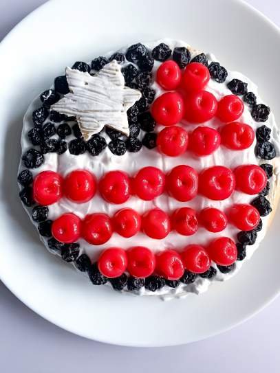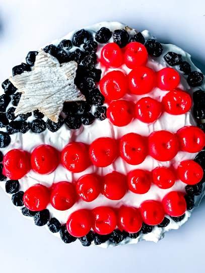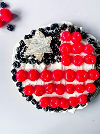 This year, I made this American Flag Fruit Pizza with Pitted Cherries and Frozen Blueberries. I generally make this recipe with cut up Strawberries, but due to lack of ingredients, I tried it with Cherries and it turned out so cute!