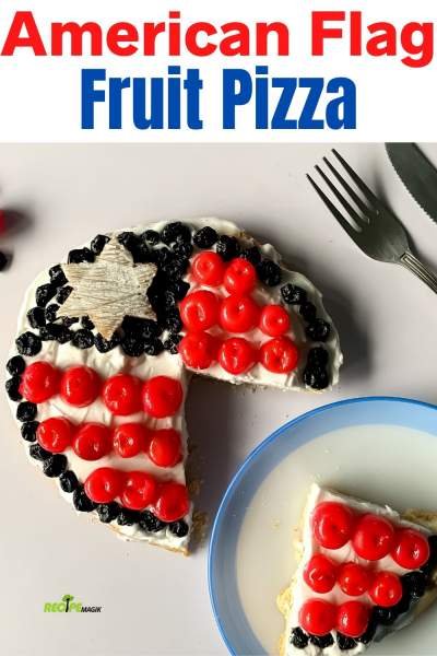 American Flag Fruit Pizza in Red, White, and Blue Colors makes a perfect Patriotic Day dessert. Made with a Sugar Cookie Crust at the bottom and topped with thick Heavy Cream and Sugar frosting, this American Flag Fruit Pizza is made with Blueberries and pitted Cherries! The star is a cute Star-shaped Sugar Cookie which is brushed with heavy cream and sugar frosting.
