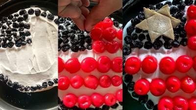 Next, it's time to add the fruits. Since I am making a July 4th Pizza so I added Blueberries and Pitted Cherries. If you're making for any other occasion or just for fun, you can really go to town on this and use any variety of colorful fruits you love.