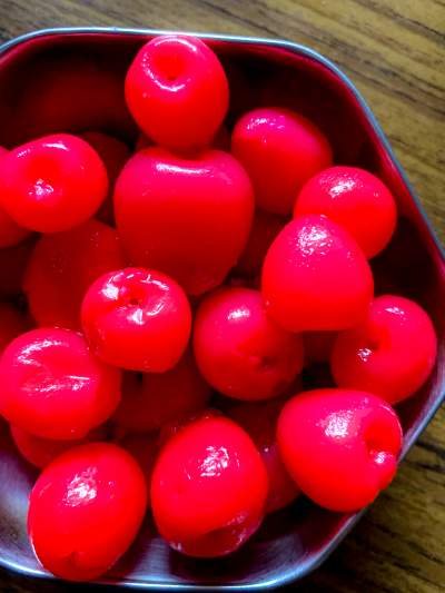 See these red Cherries? Aren't these so cute? I got them fresh from my garden. It's abundant here this season. I pit my cherries by making two holes at both its base and I poke the pit with a toothpick or chopstick. It's really easy to do and you don't waste any flesh of the cherries.