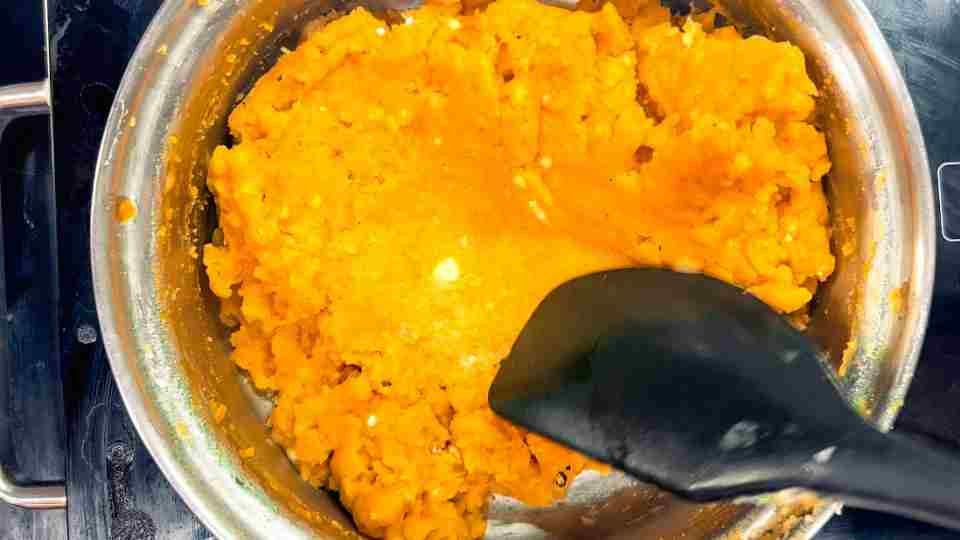 - As the butter melts, add pumpkin puree, pumpkin pie spice and whisk everything to bring the dough together.
