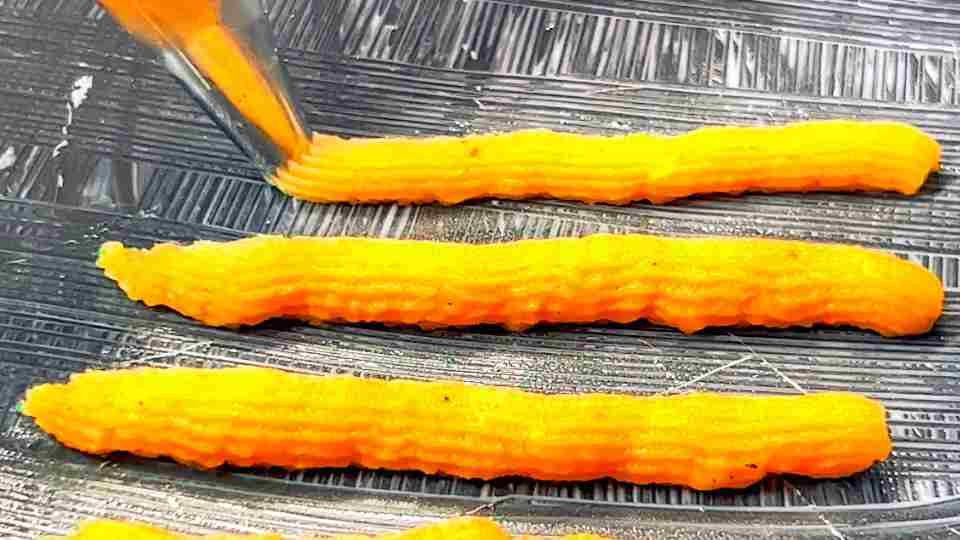 Post cooling it down, take it in a piping bag with star nozzle and pipe churros onto a greased and lined baking dish.
