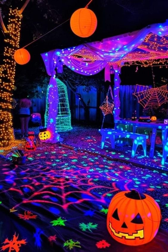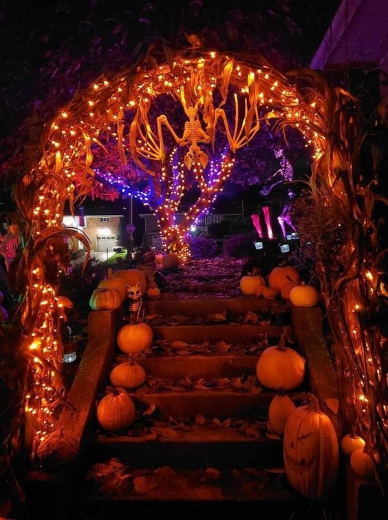 Make a cool and spooky entrance for your front door using Jack O Lantern and fall leaves. Use led lights for a perfect spooky Halloween effect.