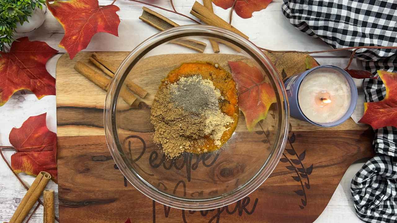 - In a large mixing bowl, combine pumpkin puree, monk fruit sweetener, flax egg, and oat milk until smooth and lump-free.
