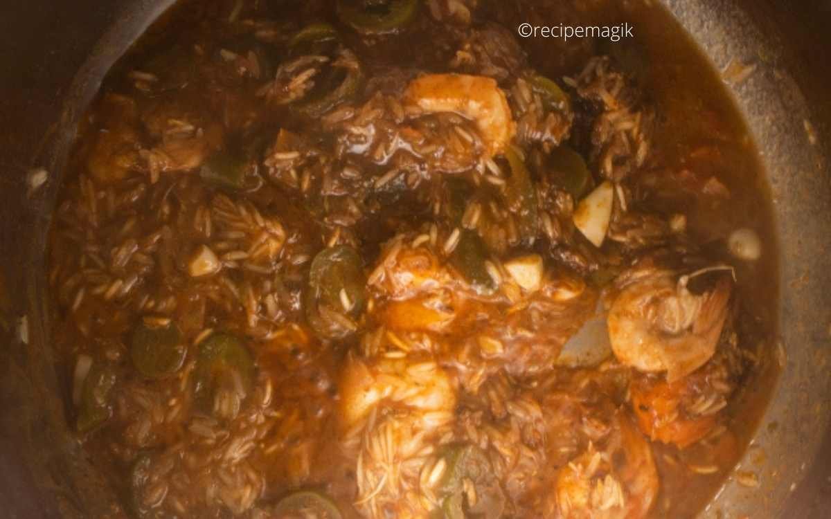 • Add the rice and shrimp. Cook for 3-4 minutes over low heat stirring occasionally