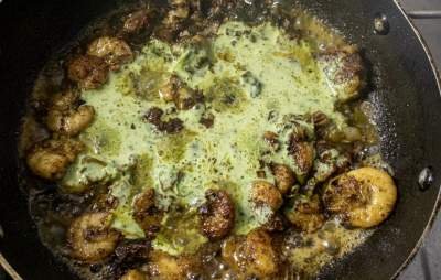 - Pour the Cilantro Sour Cream Sauce over the Shrimps. Mix well over a high flame. Once it comes to a quick boil, take it off the heat and serve.