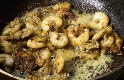 As the Garlic begins to get roasted, add the Shrimp and cook over a low flame until it gets golden brown on both sides.