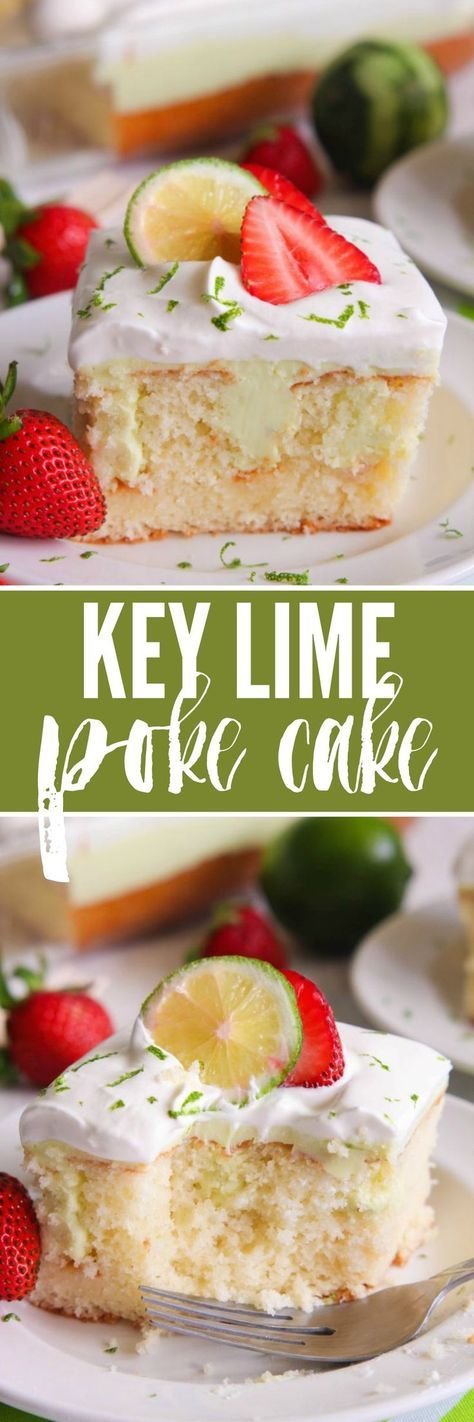 Summers should be all about desserts like this one. I just love poke cakes. They are so moist, soft, fluffy and this one is all of those and drenched in summer, topped with strawberries and cream, this recipe for Key Lime Poke cake is just too good.