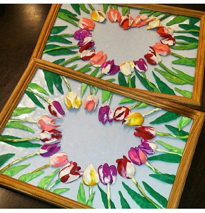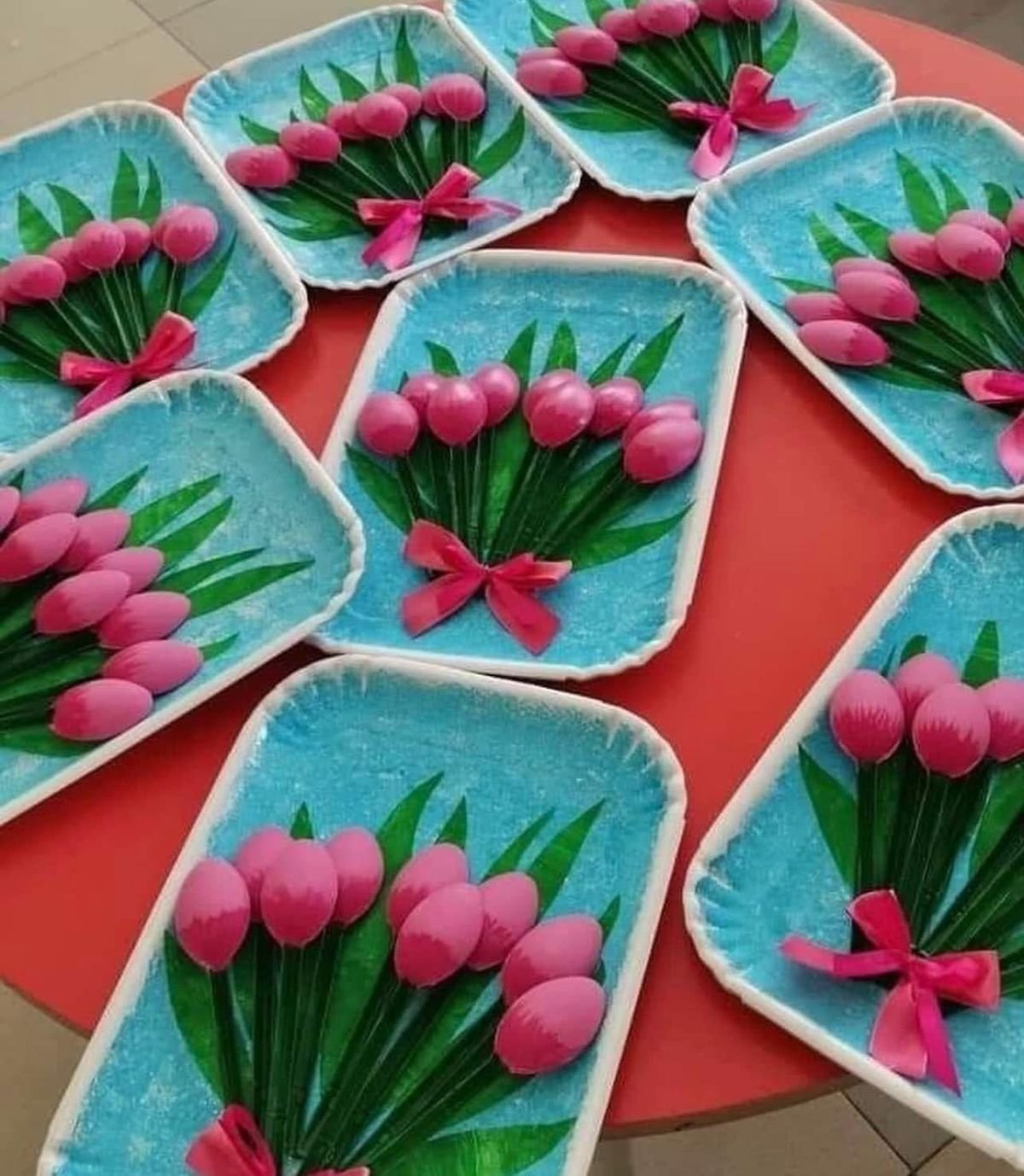Paint the rounded ends of plastic spoons in tulip colours — pink, purple, red — and glue them onto card stock in a bunch. It looks like a proper bouquet and costs almost nothing to make. Total showstopper for Mum!
