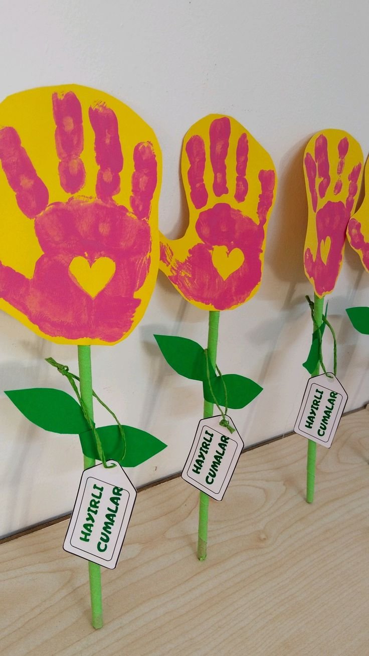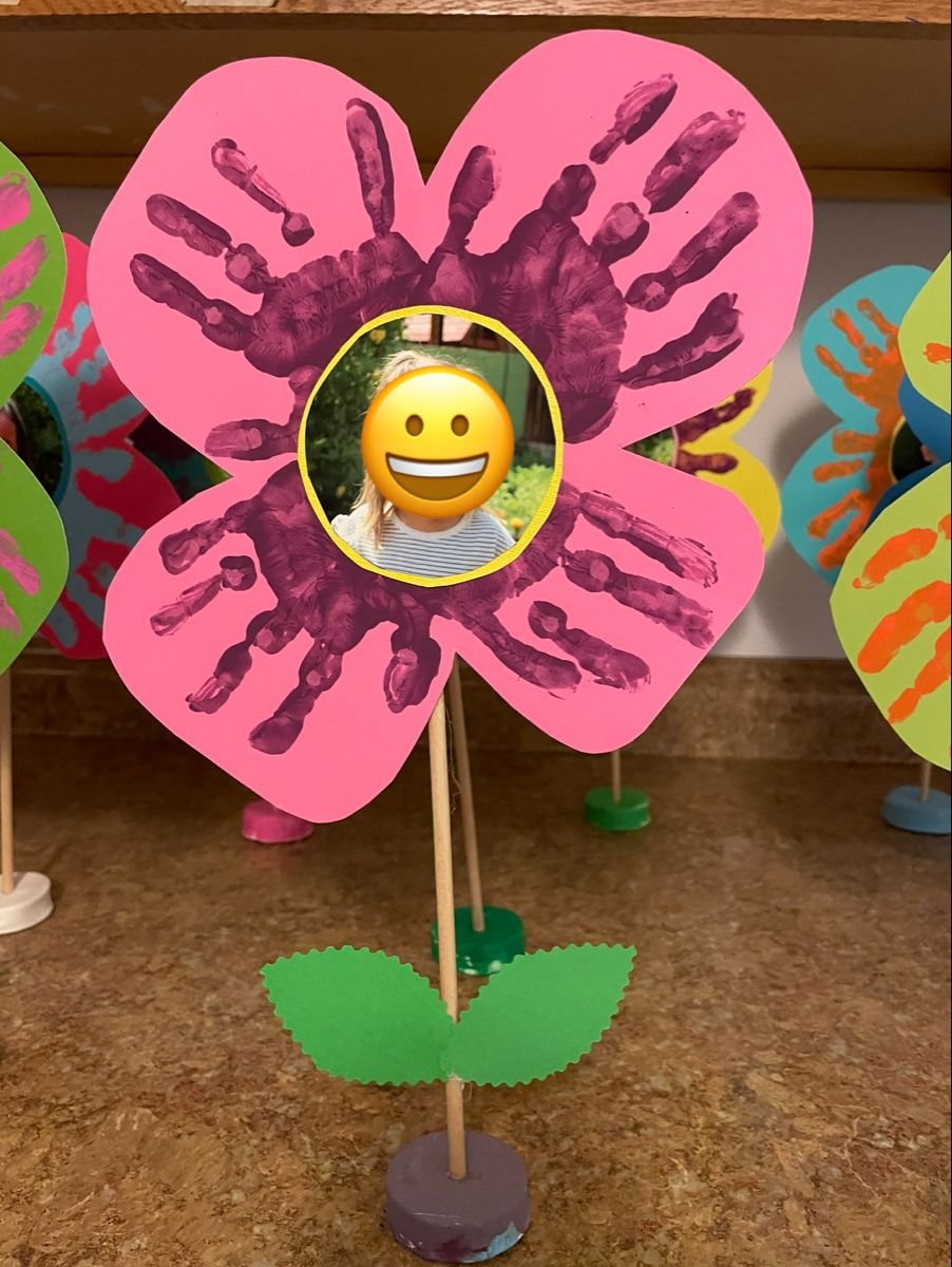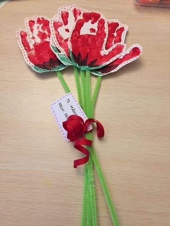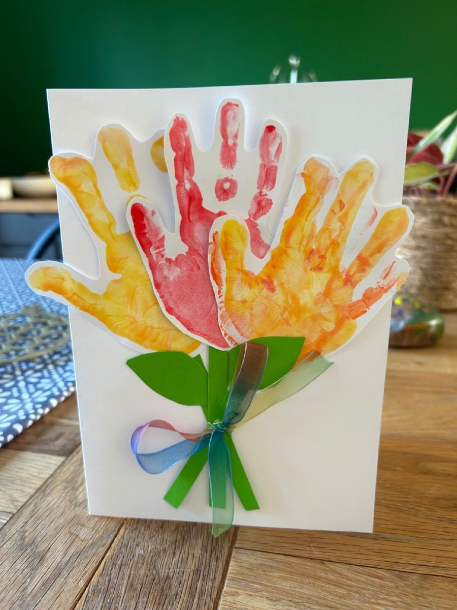 Hand Bouquet - Similar to the handprint bouquet but taken up a notch — trace around the hand instead of stamping it, then colour each finger as a different flower petal. Cut out multiple hand shapes, layer and fan them out, and glue onto a card or display paper. Kids can write their name on the stem. Sweet, creative, and a lovely keepsake as they grow. 🖐️