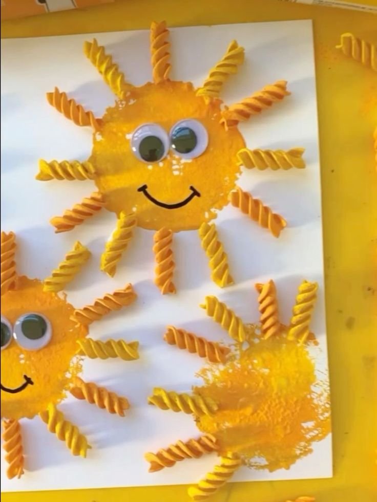 Sunflower using Spiral Pasta and Googly Eyes - This one is so much fun — and you'd never guess it starts with pasta! Grab some spiral (fusilli) pasta, a googly eye, yellow and brown paint, card stock, and glue. Start by painting your pasta pieces yellow and letting them dry completely. Once dry, arrange them in a circle on your card stock, all pointing outward like sunflower petals, and glue them down. Fill in the centre with a blob of brown or dark orange paint, then press a googly eye right in the middle while it's still wet. Add a green paper stem and leaves, and you're done!