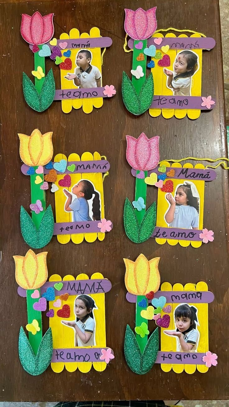 Popsicle Stick Craft - Grab a handful of popsicle sticks and arrange them into a frame or flower shape, gluing them together as you go. Paint or decorate with markers, stick on a photo of the kids in the centre, and finish with a ribbon hanger at the top. It's rustic, sweet, and costs almost nothing to make. Mum will love seeing little faces every time she looks at it. 🎨
