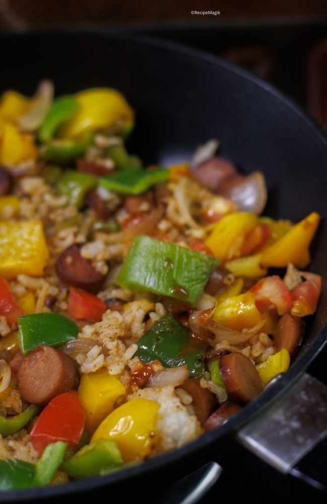 Sausage Peppers and Onions over Rice in a skillet