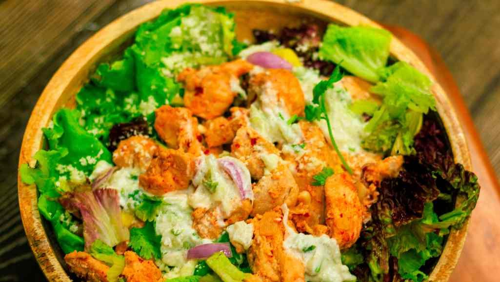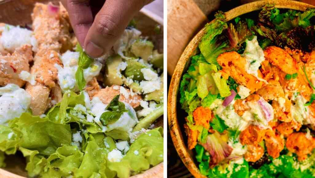 - Assemble the bowl. Add the chopped lettuce, chopped avocados, cooked chicken and Tzatziki Sauce in a bowl. Top with freshly squeezed lemon juice, fresh springs of Basil and some more of the homemade Tzatziki sauce and enjoy.