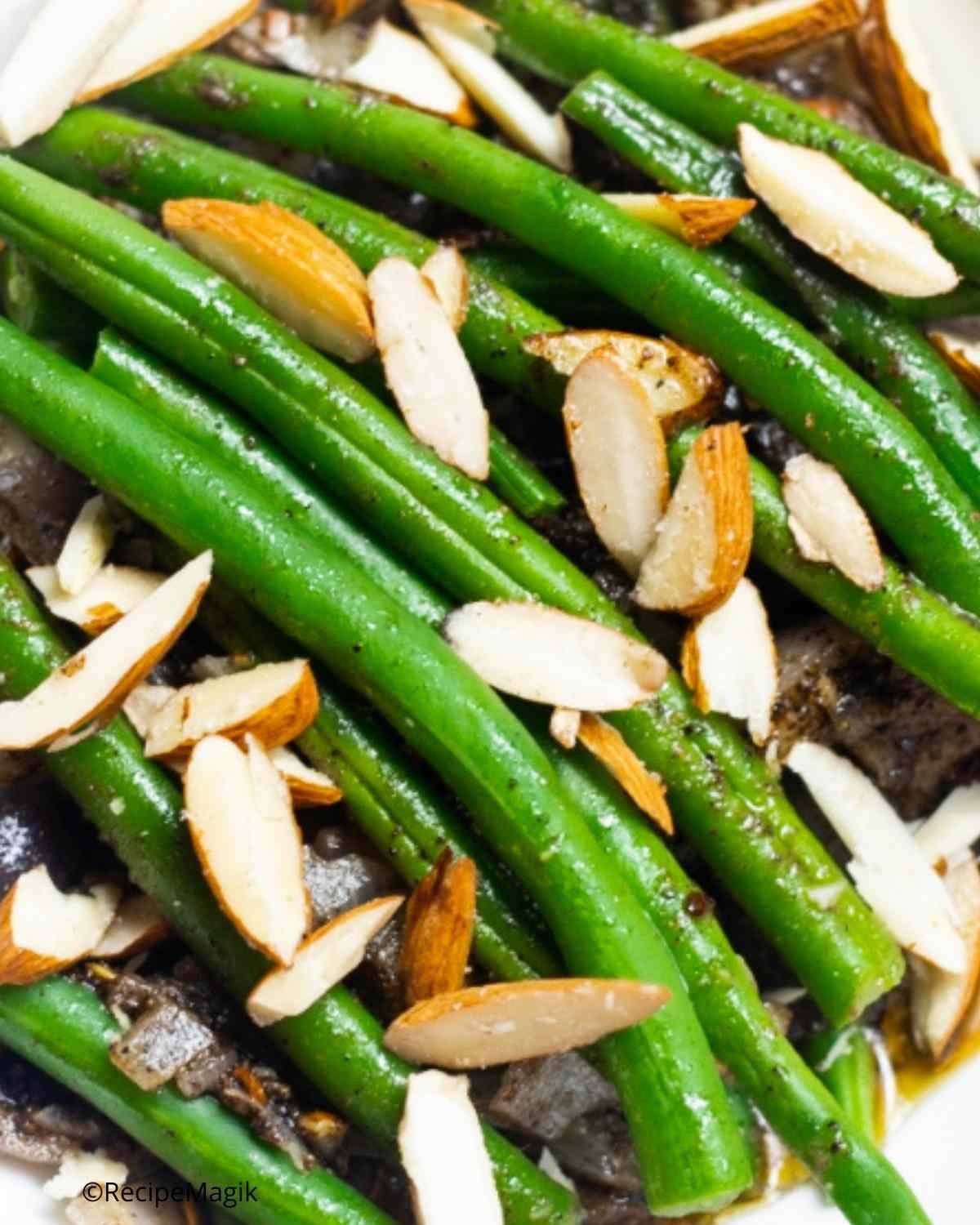 Green Bean Almondine is a traditional French Recipe where Almondine is a culinary term for almond garnish. Almonds is an integral part of French recipes. French people love almonds and they use them in so many of their recipes.