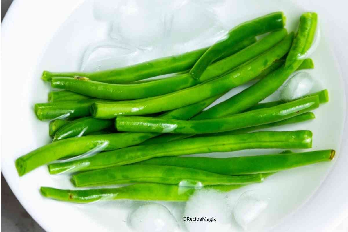 - Transfer blanched green beans to a bowl with ice cold water so that they retain their color.