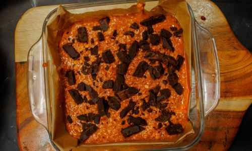 Transfer the Pumpkin Oatmeal Mixture to an 8x8 inch or 9x9 inch lined baking dish. Press down some dark chocolate chunks.