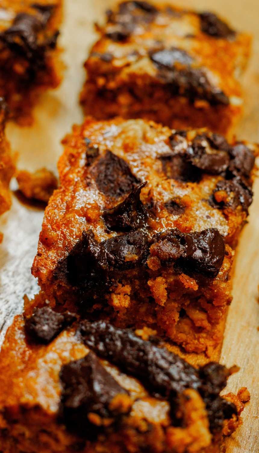 Protein Oatmeal Bars is a popular dessert you'll love at first sight. This is a healthy, easy Pumpkin Oatmeal cookie bar recipe topped with chunks of chocolate. I've used my homemade Traditional Pumpkin Spice and that makes everything so much better. Try my favorite - Gluten Free Pumpkin Waffles made using oat flour and my go-to snack - No bake Pumpkin Pie Energy Balls.