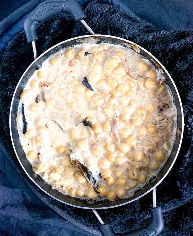 - Add the Chickpeas, Coconut Cream, and Heavy Cream to it. Stir and mix it well. Top with some more Black Pepper Powder. Cover cook for 5-10 minutes.